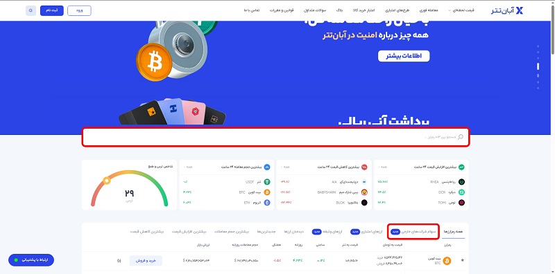 خرید و فروش سهام شرکتهای خارجی در آبان تتر بسیار ساده است. شما پس از ثبت نام در آبان تتر ، میتوانید از طریق صفحه اصلی و همانطور که در تصویر زیر قابل مشاهده است، از طریق باکسهایی که در تصویر مشخص است، نام سهام مورد نظر را جستجو کنید و وارد صفحه معاملات آن شوید.