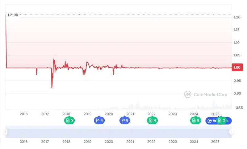 در تصویر زیر ارزش یک تتر در برابر دلار را آوردهایم و همانطور که مشاهده میکنید همیشه 1 تتر به طور تقریبی معادل 1 دلار بوده و نوسان بسیار کم و ناچیزی داشته است.