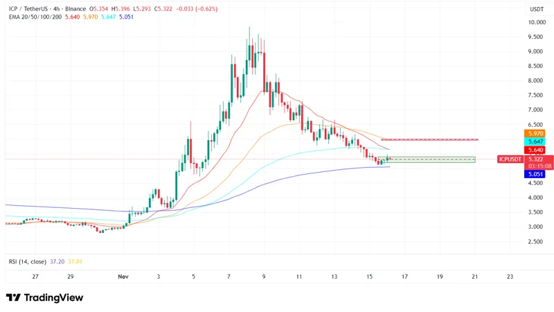 در تایمفریم روزانه، نمودار ICP/USD نشاندهنده فاز تثبیت نسبی پس از رالی صعودی اخیر است. فعلا قیمت ICP حولوحوش محدوده ۵.۲ الی ۵.۶ دلار در نوسان است و ارزش خرید ICP در این نقطه قیمتی قابل بحث است.