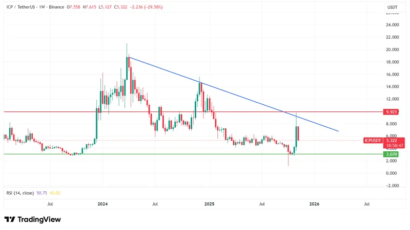 در تایمفریم هفتگی، تحلیل تکنیکال ICP نشاندهنده ضعف واضح در روند است، با این حال بعضی نشانههای تردید و احتمال بازگشت ملایم نیز دیده میشوند. قیمت فعلی ICP در هفتههای اخیر کاهش قابل توجهی را تجربه کرده است.
