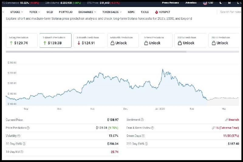 پیشبینی قیمت ارز سولانا در سال ۲۰۲۵ موضوعی است که در جامعه ارزهای دیجیتال بسیار مورد توجه قرار دارد. در واقع سولانا (SOL) بهدلیل فناوری نوآورانه بلاکچین و اکوسیستم رو به رشد خود، توجه بسیاری از تریدرهای بازار کریپتو را به خود جلب کرده است. همچنین سرمایهگذاران بلندمدت میخواهند اطلاعات مرتبط با پیشبینی قیمت ارز سولانا تا سال ۲۰۳۰ را در منابع قابل اعتماد مطالعه کنند تا بتوانند تصمیمگیری بهتری داشته باشند. البته باید بدانید که نظر منابع مختلف در مورد آینده ارز سولانا تفاوتهای زیادی دارد. برای مثال در تصویر زیر پیشبینی هفتگی (۱۲۹.۷۴ دلار)، ماهانه (۱۳۹.۳۸دلار) و سه ماهه (۱۲۴.۹۱دلار) را برای این ارز در سایت coincodex مشاهده میکنید.