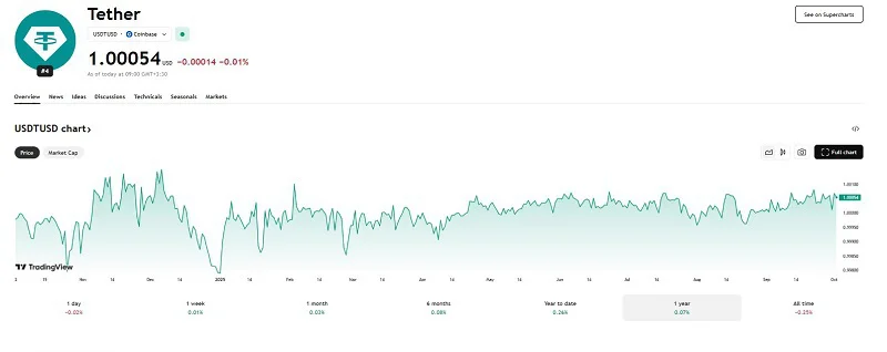 برای مثال همانطور که در تصویر بالا مشاهده میکنید، قیمت تتر به دلار در یک سال اخیر کمتر از 2 درصد نوسان داشته است. این یعنی سقوط تتر احتمالا یک سناریوی بسیار دور از ذهن و نامحتمل است.