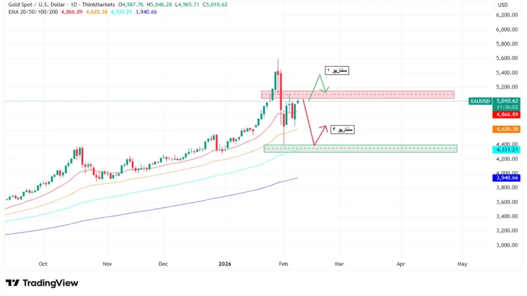 با توجه به قرار گرفتن اونس جهانی طلا در محدوده ۵۰۰۰ دلار در تاریخ ۹ فوریه، ساختار بازار وارد فاز حساسی شده است. این محدوده از نظر روانی و تکنیکال اهمیت بالایی دارد و می‌تواند نقش تعیین‌کننده‌ای در مسیر کوتاه‌مدت طلا ایفا کند.