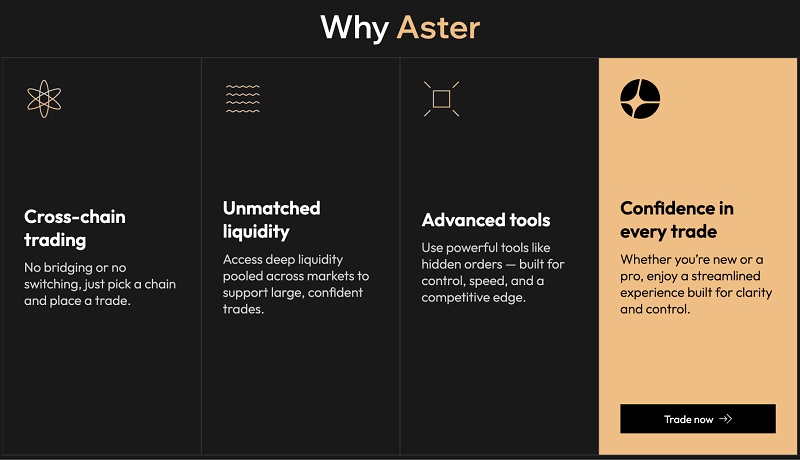 Aster یک صرافی غیرمتمرکز (DEX) با تمرکز بر بازارهای فیوچرز و اسپات است که تلاش میکند تجربه معاملاتی مشابه صرافیهای متمرکز را در قالب غیرامانی و روی زنجیره (on-chain) فراهم کند. ویژگیهای کلیدی عبارتاند از: پشتیبانی از معاملات اسپات و پرپِچوال، ابزارهای پیشرفته سفارشگذاری، امکان معامله سهام توکنیزهشده و مدل غیرامانی (non-custodial) که کاربران کلیدهای خصوصی خود را نگه میدارند.