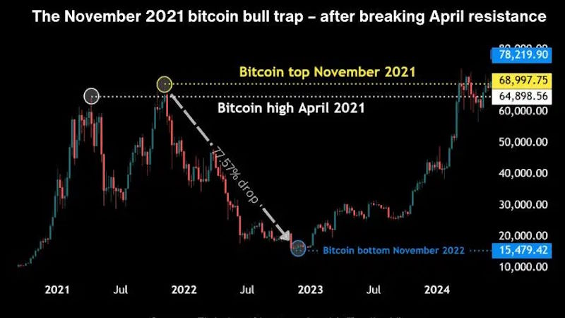 تاریخ بازار کریپتو پر از نمونه‌های کلاسیک از تله گاوی در ارز دیجیتال است، اما شاید هیچ‌کدام به اندازه اوج بازار در اواخر سال 2021، آموزنده و بزرگ نباشد. این نمونه به خوبی نشان می‌دهد که چگونه حتی قدرتمندترین دارایی بازار یعنی بیت کوین نیز می‌تواند در دام این الگوی فریبنده بیفتد.